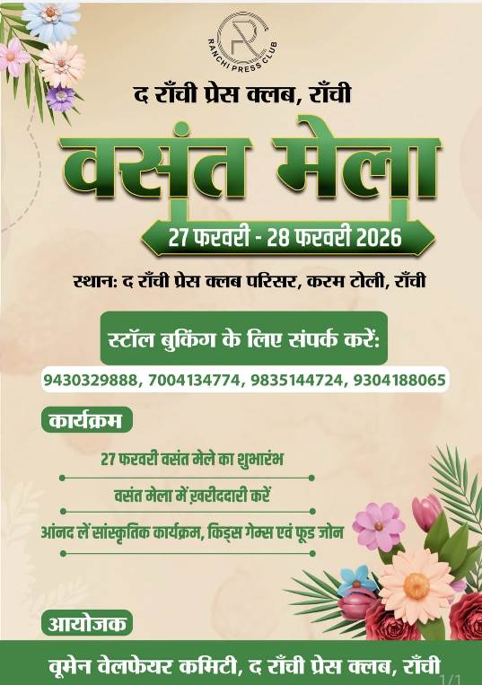 रांची: राजधानी के पत्रकारों और उनके परिवारों के लिए खुशियों की दस्तक होने वाली है। रांची प्रेस क्लब आगामी 27 और 28 फरवरी को दो दिवसीय भव्य “वसंत मेला” का आयोजन करने जा रहा है। इस आयोजन की तैयारियों को लेकर मंगलवार को क्लब परिसर में अध्यक्ष शंभु नाथ चौधरी की अध्यक्षता में एक महत्वपूर्ण बैठक संपन्न हुई।